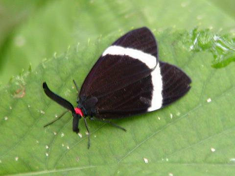 頭部は赤く、羽は黒地に白く斜めに帯がある。 |